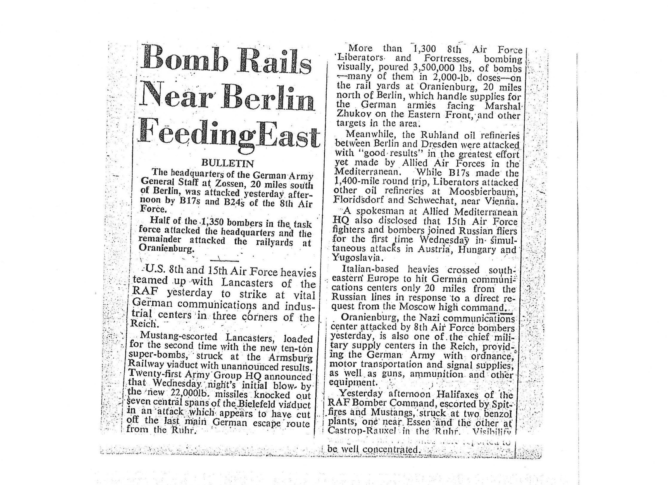 1945 newspaper clipping explaining the significance of Oranienburg as a target. As well as being the centre for Nazi research into the atomic bomb, the town was also one of the key communications and military supply centres in the Reich